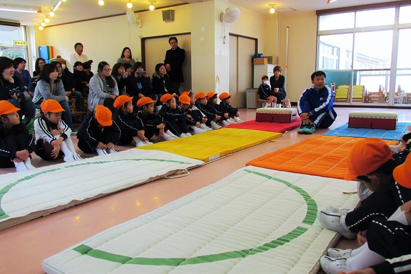 ところで、今週は保育参観の週。本日は年長おひさま組のご家族がお越しです。今回のテーマは体操。マット運動をご覧頂きます。